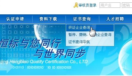 2、鼠標(biāo)移動(dòng)到網(wǎng)站導(dǎo)航條“證書查詢”上彈出下拉菜單,點(diǎn)擊下拉菜單中的“獲證企業(yè)查詢”;